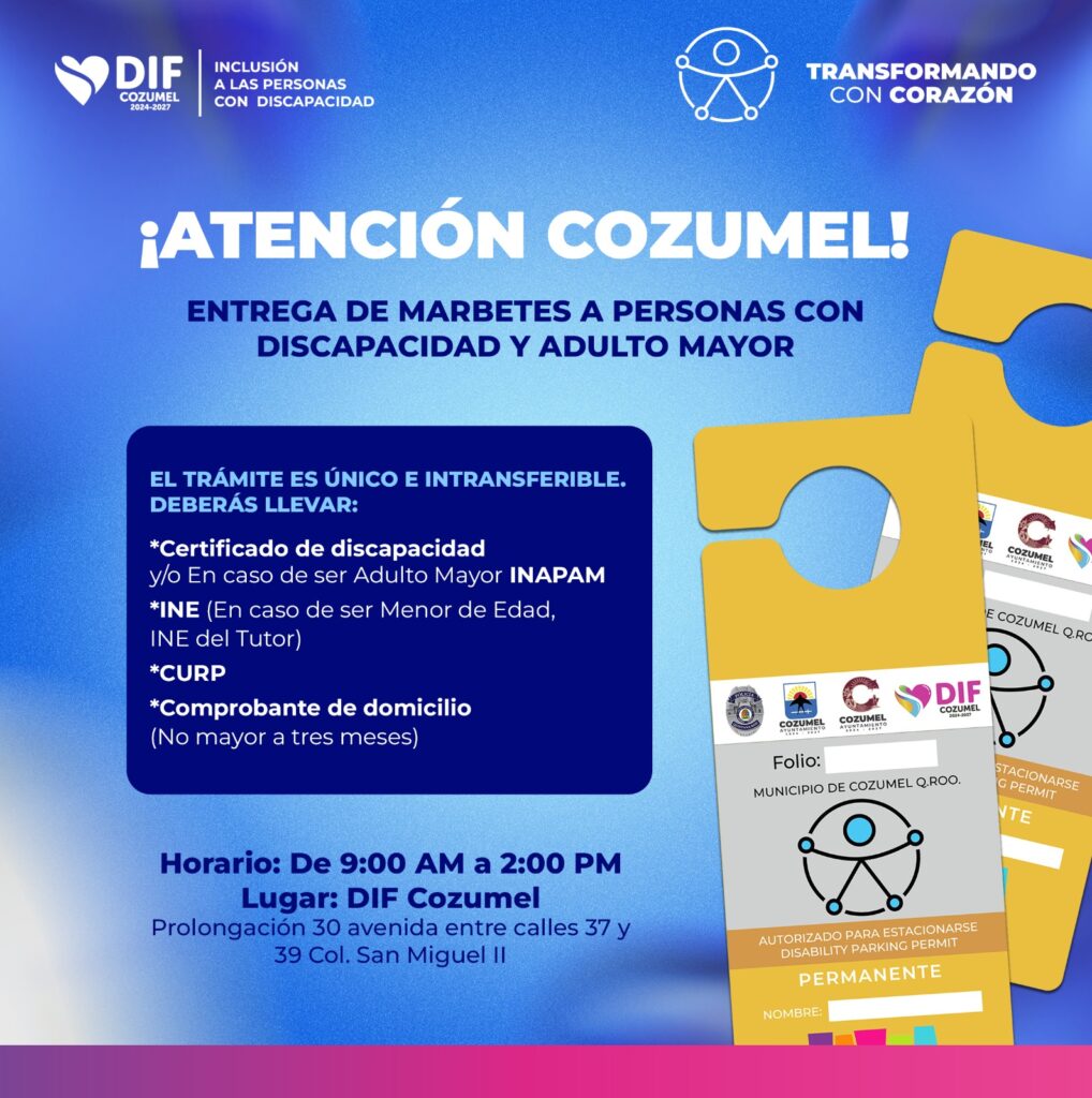 Cozumel, Quintana Roo, 8 de diciembre de 2025 – El Gobierno de José Luis Chacón, a través del Sistema para el Desarrollo Integral de la Familia que preside Diana Sosa Blanco, en su compromiso con la inclusión y el bienestar social, informa a la comunidad sobre la Entrega de Marbetes de Estacionamiento exclusivos para Personas con Discapacidad y Adultos Mayores.