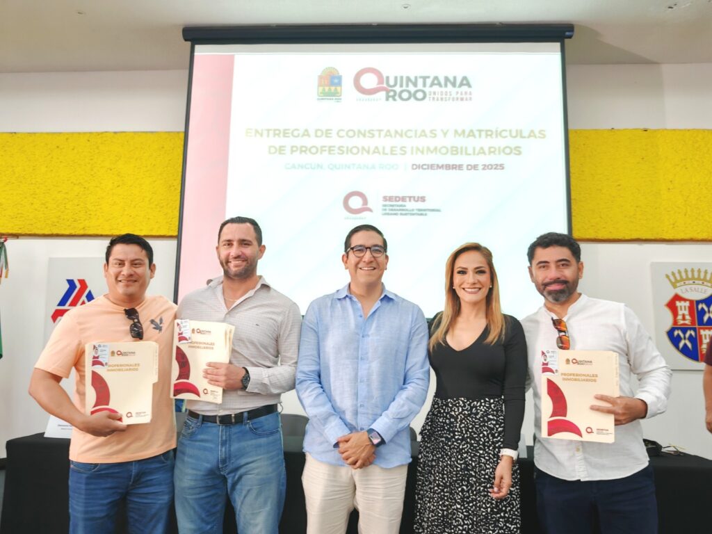 Cancún.- Con el objetivo de fortalecer la profesionalización, brindar mayor certeza jurídica y orden en el desarrollo inmobiliario del estado, la Secretaría de Desarrollo Territorial Urbano Sustentable (SEDETUS) realizó la entrega de 195 matrículas a profesionales inmobiliarios, en un evento realizado en la Universidad La Salle Cancún.