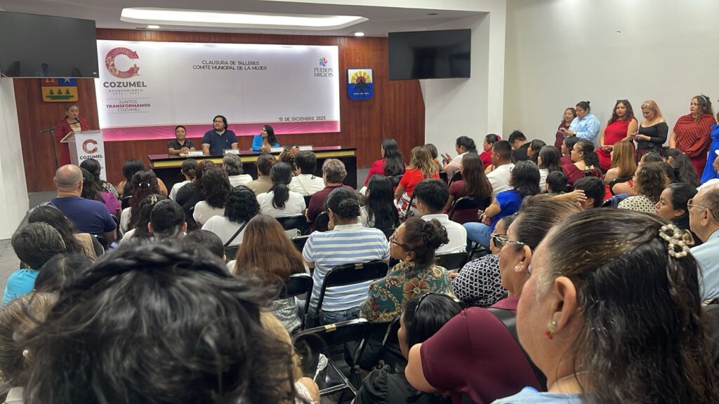Cozumel, a 16 de diciembre de 2025.- El gobierno municipal de Cozumel, que encabeza el presidente municipal José Luis Chacón Méndez, llevó a cabo la clausura de los talleres del Comité Municipal de la Mujer (COMUMU), en un evento en el que se reconoció el esfuerzo de las 101 alumnas, así como la dedicación de las y los profesores y de todo el equipo que integra este comité, quienes de manera conjunta contribuyen al fortalecimiento y desarrollo de las mujeres cozumeleñas.