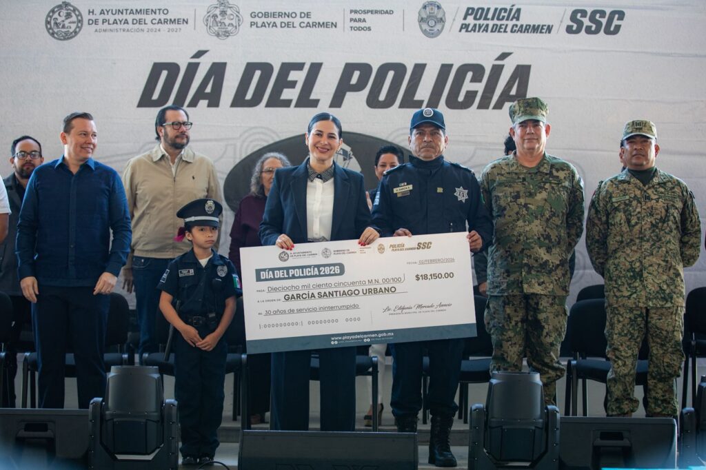 Playa del Carmen, Quintana Roo, 2 de febrero de 2026.— En el marco de la conmemoración del Día del Policía, la presidenta municipal Estefanía Mercado reconoció la vocación, disciplina y valentía de mujeres y hombres que integran la Secretaría de Seguridad Ciudadana Municipal (SSCM), a quienes entregó bonos y estímulos económicos por 10, 15, 20, 25 y 30 años de servicio.