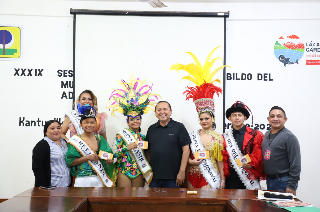 Reunidos en la sala de cabildo del Ayuntamiento, el presidente municipal presentó a Mariaangel Naydeli Dzib Ek y Javier Cocom Koyoc como reyes infantiles; Mónica Fernanda Avalos Guerrero y Carlos Amir Ku Noh reyes del Carnaval y Jaqueline Hurtado Reina de la diversidad sexual a quienes les impuso la corona y bandas como soberanos de las fiestas del rey momo.