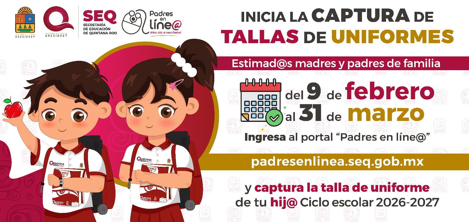 Chetumal.- La Secretaría de Educación de Quintana Roo (SEQ), que encabeza la titular Elda Xix, informa que, del 9 de febrero al 31 de marzo del presente año, a través de la plataforma Padres en Línea, las madres, padres de familia y tutores, podrán realizar la captura de las tallas de uniformes de sus hijos o hijas, que estudian en escuelas públicas de preescolar, primaria y telesecundaria, correspondiente al ciclo escolar 2026-2027.
