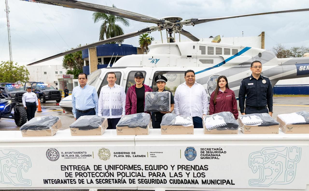 Playa del Carmen, Quintana Roo, 17 de marzo de 2026.— Con una inversión superior a 38.7 millones de pesos provenientes del Fondo de Aportaciones para el Fortalecimiento de los Municipios (FORTAMUN), la presidenta municipal Estefanía Mercado entregó uniformes, equipo táctico y cámaras corporales a elementos de la Secretaría de Seguridad Ciudadana Municipal (SSCM).