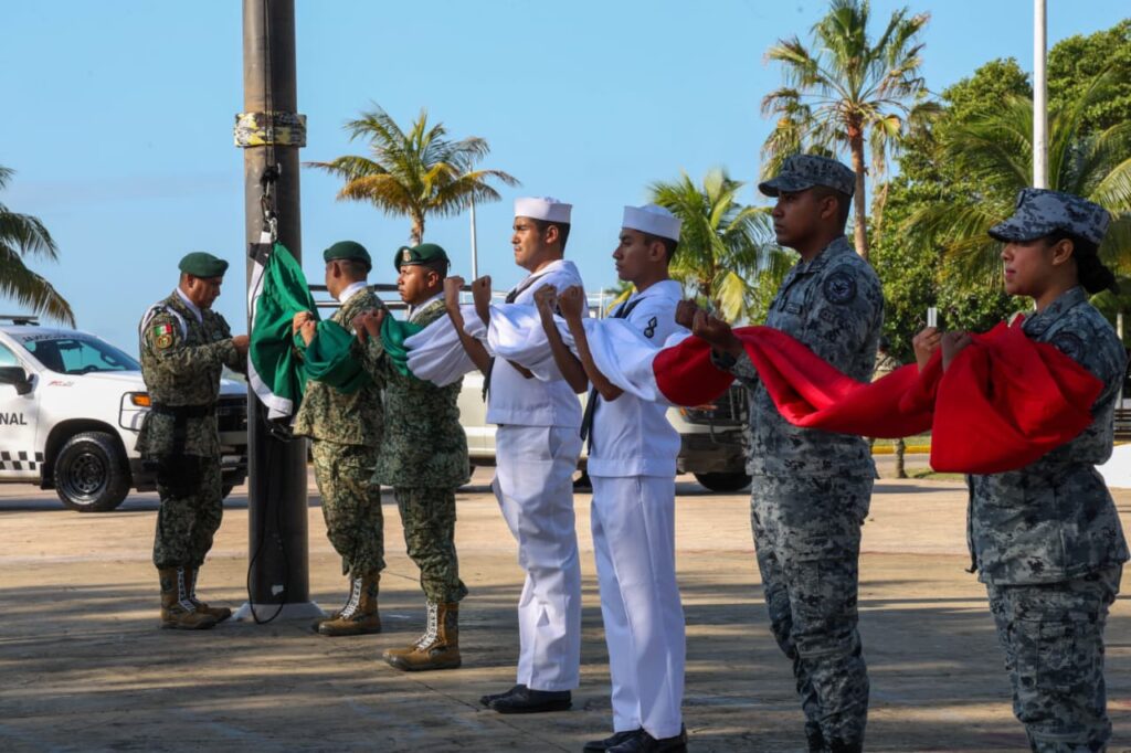 Durante el acto cívico, elementos de la Secretaría de la Defensa Nacional, Guardia Nacional y Marina realizaron el izamiento de la Bandera Nacional a toda asta, acompañado por el toque de bandera interpretado por la banda de guerra de la Guardia Nacional.