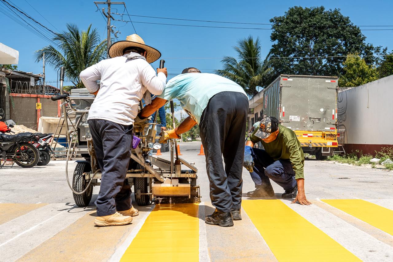 Cozumel, a 8 de abril de 2026.- El gobierno municipal que encabeza José Luis Chacón Méndez realizó trabajos de marcaje de cruces peatonales en escuelas públicas de la isla, utilizando pintura termoplástica con microesferas que permite mayor visibilidad y reflejancia con la luz de los vehículos, con el objetivo de fortalecer la seguridad vial y proteger a niñas, niños, padres de familia y personal educativo durante los horarios de entrada y salida.