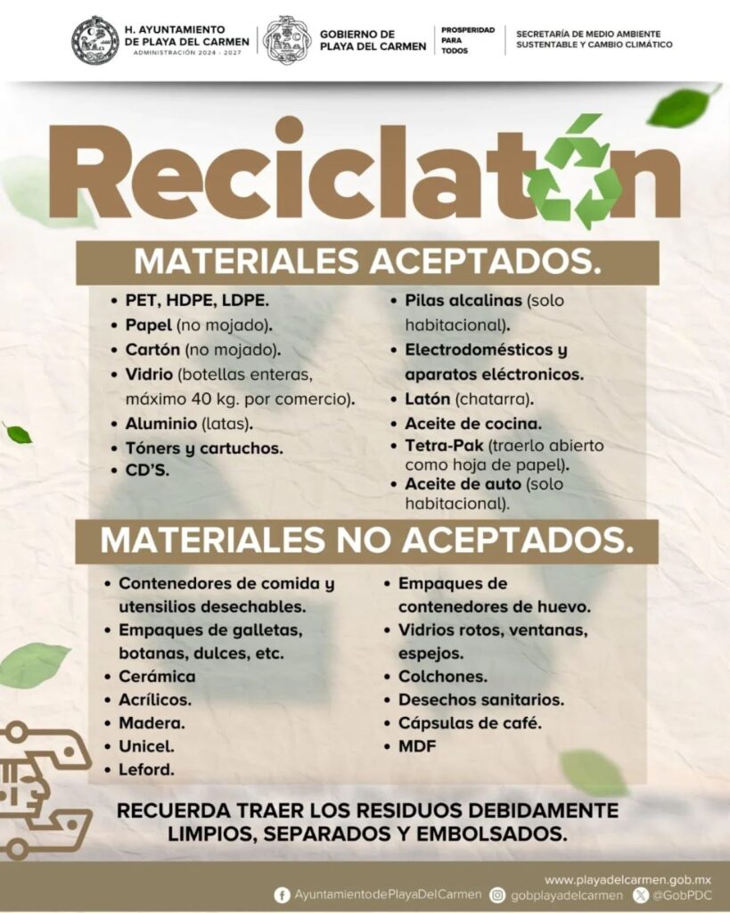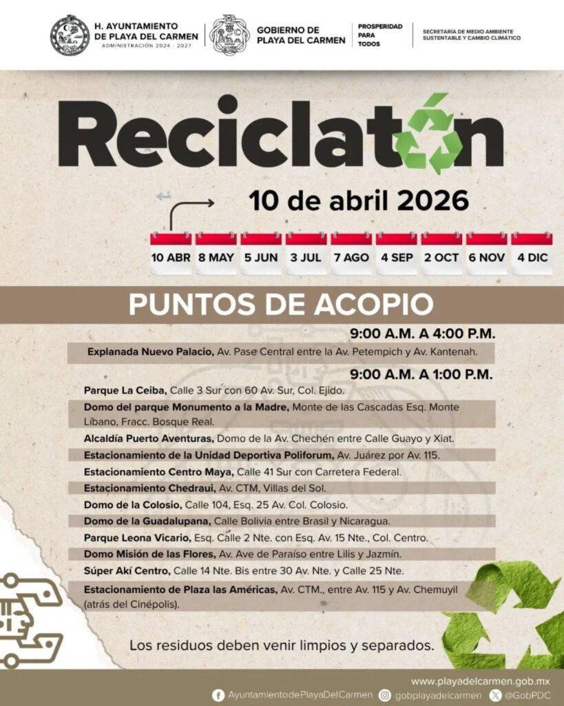 Playa del Carmen, Quintana Roo, 8 de abril de 2026.— El gobierno de Playa del Carmen, que encabeza la presidenta municipal Estefanía Mercado, fortalece la protección del entorno y promueve la cultura del reciclaje mediante el programa “Reciclatón”, a través de la Secretaría de Medio Ambiente Sustentable y Cambio Climático.