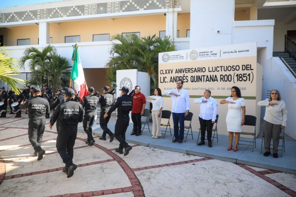 Playa del Carmen, Quintana Roo, 15 de abril de 2026.— En el marco del CLXXV Aniversario Luctuoso del Andrés Quintana Roo, el gobierno municipal, encabezado por la presidenta Estefanía Mercado, llevó a cabo una ceremonia cívica en elpatio central del antiguo Palacio Municipal, donde autoridades destacaron la vigencia de su legado en la identidad y vida pública del estado.